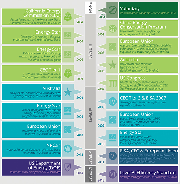 In the early 90’s, it was estimated that there were more than one billion external power supplies active in the United States alone. The efficiency of these power supplies, mainly utilizing linear technology, could be as low as 50% and still draw power when the application was turned off or not even connected to the power supply (referred to as “no-load” condition). Experts calculated that without efforts to increase efficiencies and reduce “no-load” power consumption, external power supplies would account for around 30% of total energy consumption in less than 20 years. As early as 1992, the US Environmental Protection Agency started a voluntary program to promote energy efficiency and reduce pollution which eventually became the Energy Star program. However, it was not until 2004 that the first mandatory regulation dictating efficiency and no-load power draw minimums was put in place. The info graph below traces the path from the CEC’s 2004 regulation up to the new Level VI standards set to take effect February 2016.