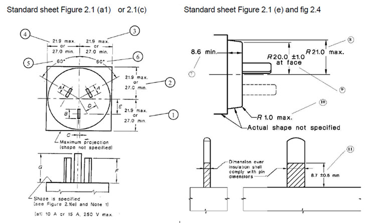 这里特别要主意一点,澳规插片部分有一部分外部是包有绝缘层的,绝缘插片的插头的带电部件应在绝缘层下面而不外露.也就是图片中的11这个部分.